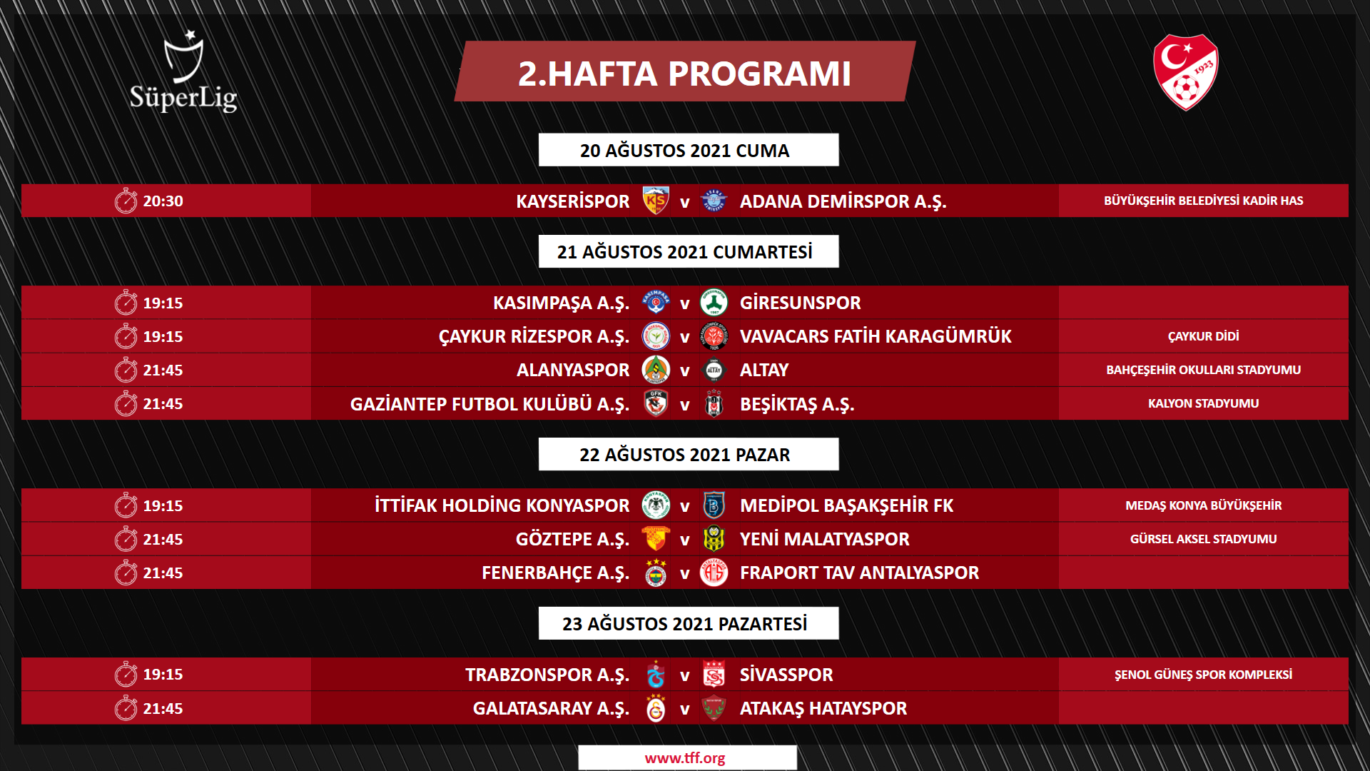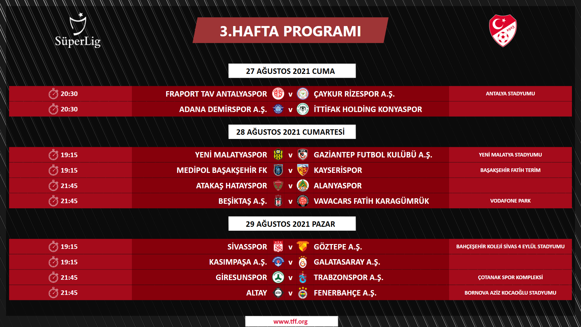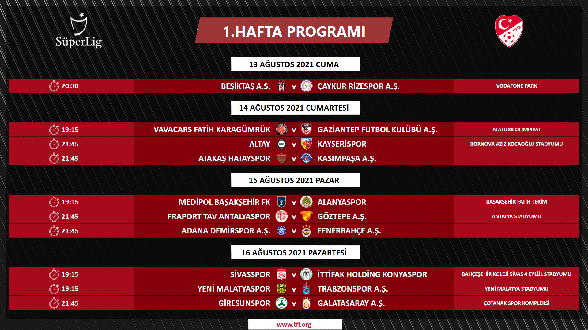 İSTANBUL (TSA)-Trendyol 1. Lig’de sezonun son haftası olan 38. haftanın maç programı Türkiye Futbol Federasyonu tarafından duyuruldu. Kritik haftada tüm karşılaşmalar, ligdeki sıralamayı doğrudan belirleyecek. 1 Mayıs 2026 Cuma 14.30 | Atakaş Hatayspor – İmaj Altyapı Van Spor FK 17.00 | İstanbulspor A.Ş. – Adana Demirspor A.Ş. 17.00 | Boluspor...