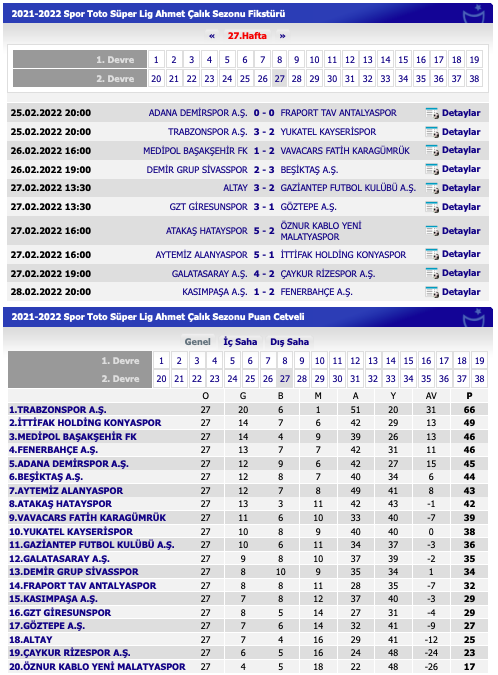 Süper Lig’de 27. Haftanın toplu sonuçları ve puan durumu şöyle: