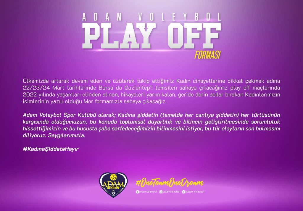 Daha önce maçlara MOR FORMA ile çıkan Adam Voleybol takımı, 22-24 Mart tarihlerinde oynanacak Play Off yarı final etabına yine MOR FORMA ile ancak bu sefer yaşamları ellerinde alınan kadınların isimlerinin yer aldığı MOR FORMA ile sahaya çıkacak.