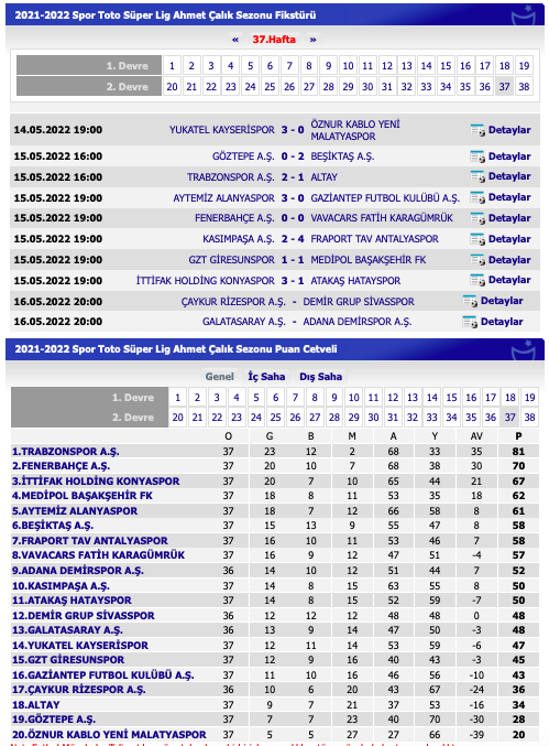 Spor Toto Süper Lig’in 37. Haftasının toplu sonuçları ve puan durumu şöyle: