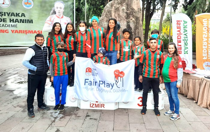 Dünya Fair Play Şeref Diploması ödülü kazanan Bostanlıspor Klübü sporcuları kürsüde