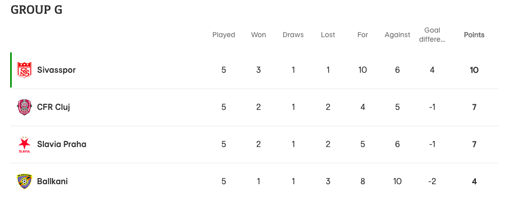 UEFA Konferans Ligi G Grubu’nun son maçlarında Demir Grup Sivasspor, 3 Kasım Perşembe günü Slaiva Prag deplasmanına çıkacak. Cluj ise sahasında Balkani’yi konuk edecek. Temsilcimiz Çekya’dan puanla dönmesi halinde lider olarak son 16 turuna yükselecek. Aksi durumda ise 2. sırada yer alarak play-off oynayacak.