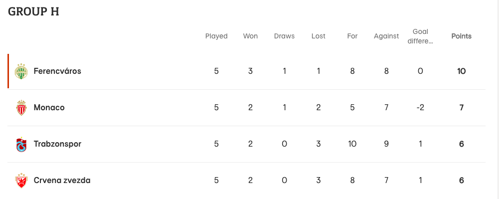 Bu sonuçla beraber Kızılyıldız puanını 6’ya çıkararak Trabzonspor ile puanını eşitledi. Grubun diğer karşılaşmasında Ferencvaros evinde Monaco ile 1-1 berabere kaldı ve Trabzonspor gruptan çıkma şansını gelecek hafta evinde oynayacağı Ferencvaros maçına bıraktı.