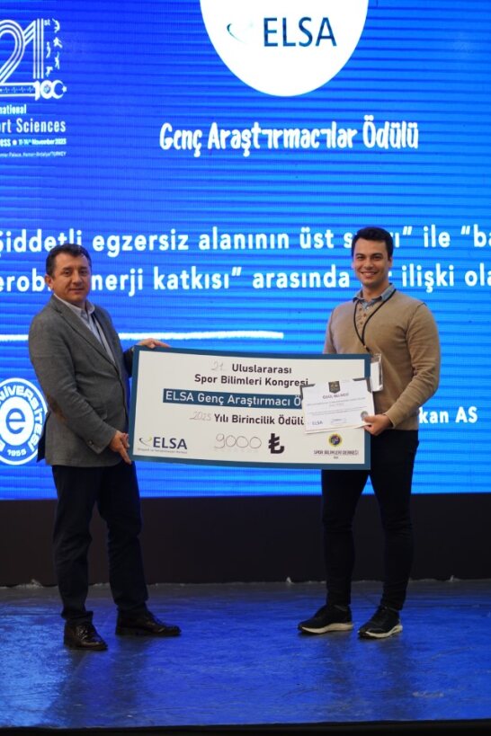 ELSA Genç Araştırmacı Ödülleri’nde 1.liği Ege Üniversitesi SBF’den Arda Peker’in sunduğu “Şiddetli egzersiz alanının üst sınırı” ile “baskın aerobik enerji katkısı” arasında bir ilişki olabilir; 2.liği, Ege Üniversitesi SBF’den Hakan As’ın sunduğu “Respirasyon eşiği yönteminin güvenilirliği ve geçerliliği” ve 3.lüğü, sunumunu Hacettepe Üniversitesi SBF’den Caner Mavili’nin yaptığı “Eğrisel ve doğrusal sprintler arasındaki ilişkinin kuvvet-zaman perspektifinden incelenmesi” başlıklı bildiriler kazandı.