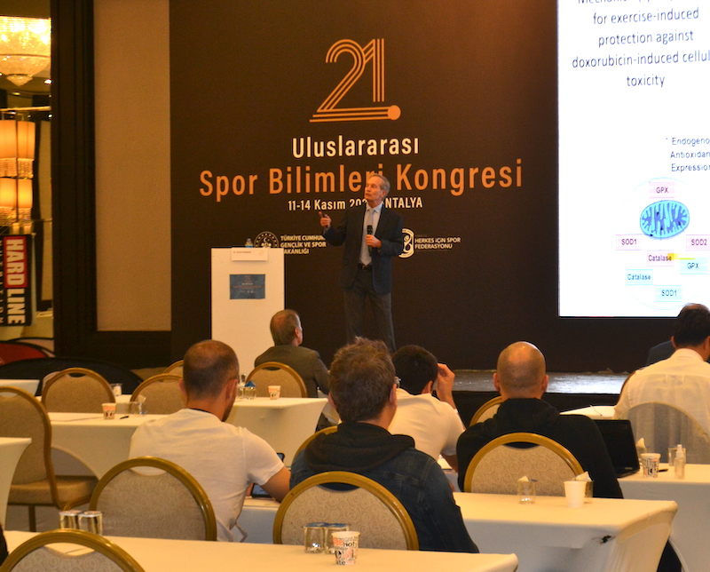 Kongre ana konuşmacılarından Dr. Scott Powers, “Redox signaling in endurance exercise-induced adaptation” başlıklı sunumunda, egzersizin mitokondri kaynaklı serbest radikal artışına yol açtığının bilindiğini, serbest radikallerin bir yandan DNA, protein ve lipid yapısında hasara yol açarken bir yandan da sinyal molekülü olarak vücudun egzersize adaptasyonunda rol oynadığını belirtti, dayanıklılık antrenmanına adaptasyonda serbest radikallerin redoks dengesi üzerinden nasıl bir rol oynadığını, bu rolde görev alan kilit molekülleri deney hayvanları modellerinde elde ettikleri sonuçlar ve literatür bulguları üzerinden tartıştı.