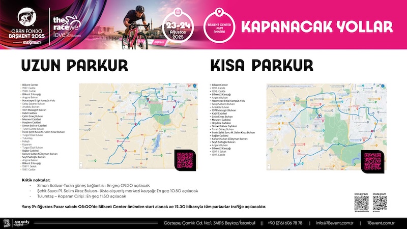 Yarış 24 Ağustos Pazar sabahı 08:00’de Bilkent Center önünden start alacak ve 12.30 itibarıyla tüm parkurlar trafiğe açılacak.