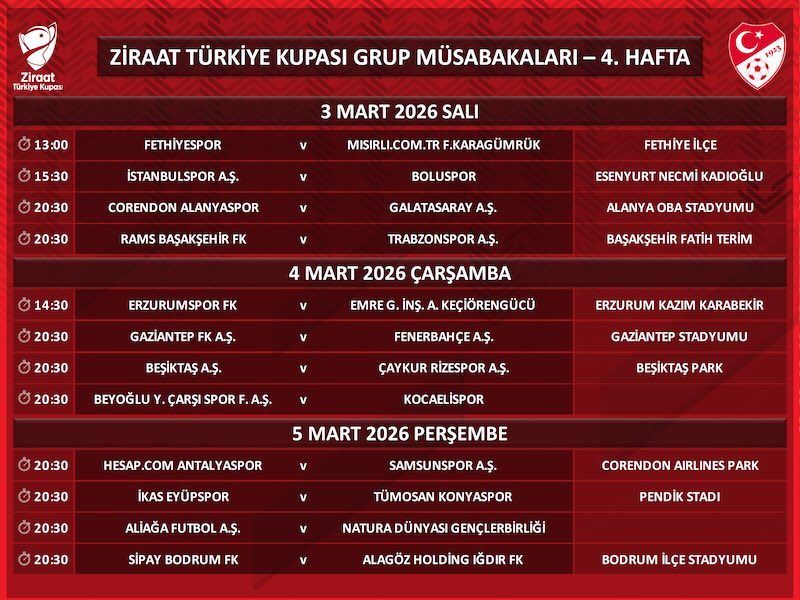 İSTANBUL (TSA)-Ziraat Türkiye Kupası grup müsabakalarının 4. hafta maç programı duyuruldu. Açıklamaya göre, saha bilgisi henüz belirlenmeyen karşılaşmaların hangi statta oynanacağı ilerleyen günlerde ilan edilecek. Öte yandan, gruplarda birbirini ilgilendiren müsabakalar aynı gün ve saatlerde planlandı.