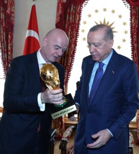 Türkiye’nin futbol yatırımları ve FIFA Arena projesi kapsamında atılan adımların değerlendirildiği görüşme, spor diplomasisi açısından da güçlü bir kare ortaya koydu. FIFA’nın Türkiye’deki projelere verdiği destek, özellikle altyapı ve saha yatırımları bakımından önem taşırken, buluşmanın bu iş birliğini daha da ileri taşıması bekleniyor. Ziyaret sırasında FIFA Başkanı Gianni Infantino, Cumhurbaşkanı Erdoğan’a üzerinde “Erdoğan” yazılı 26 numaralı forma, Dünya Kupası replikası ve turnuva topu takdim etti. TFF Başkanı İbrahim Ethem Hacıosmanoğlu ise Cumhurbaşkanı Erdoğan’a A Milli Takım forması sundu.
